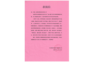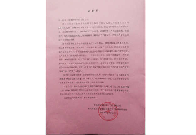 中鐵四局集團第一工程有限公司向河南二建集團鋼結(jié)構有限公司發(fā)來表揚信